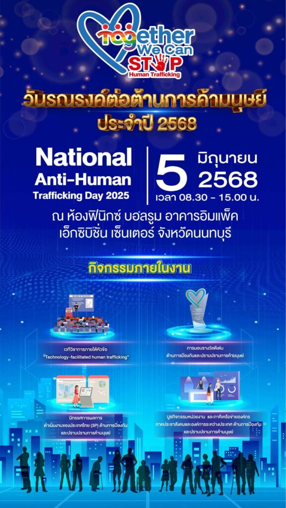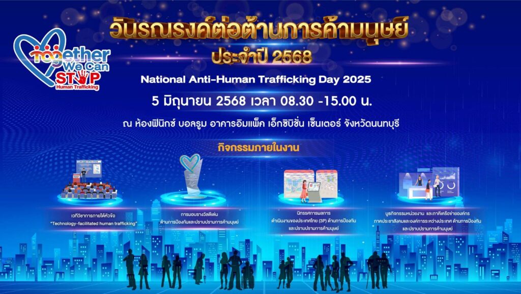 กระทรวงการพัฒนาสังคมและความมั่นคงของมนุษย์ กำหนดจัดงานวันรณรงค์ต่อต้าน การค้ามนุษย์ ประจำปี ๒๕๖๘ ในวันพฤหัสบดีที่ ๕ มิ.ย. ๒๕๖๘ เวลา ๐๘.๓๐ – ๑๕.๐๐ น. ณ ห้องฟีนิกซ์ บอลรูม อาคารอิมแพ็ค เอ็กซิบิชั่น เซ็นเตอร์ จังหวัดนนทบุรี และถ่ายทอดสดผ่านทาง Facebook Live กองต่อต้านการค้ามนุษย์ สป.พม. เพื่อแสดงเจตนารมณ์ความมุ่งมั่นของรัฐบาลไทยในการป้องกันและปราบปรามการค้ามนุษย์ให้หมดสิ้นไปจากประเทศไทย หรือ Zero Tolerance รณรงค์เผยแพร่การดำเนินงานต่อต้านการค้ามนุษย์ของประเทศไทย สร้างความรู้ความเข้าใจที่ถูกต้องเกี่ยวกับการต่อต้านการค้ามนุษย์ให้แก่ประชาชน ภาคีเครือข่ายที่เกี่ยวข้อง ทั้งหน่วยงานภาครัฐส่วนกลางและส่วนภูมิภาค องค์กรพัฒนาเอกชน องค์การระหว่างประเทศ รวมทั้งสื่อมวลชน เพื่อผนึกกำลังของหน่วยงานที่เกี่ยวข้องของประเทศไทยในการป้องกันและปราบปรามการค้ามนุษย์ให้เห็นเป็นที่ประจักษ์และได้รับการยอมรับในเวทีระดับสากลต่อไป