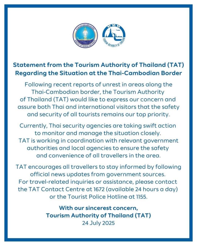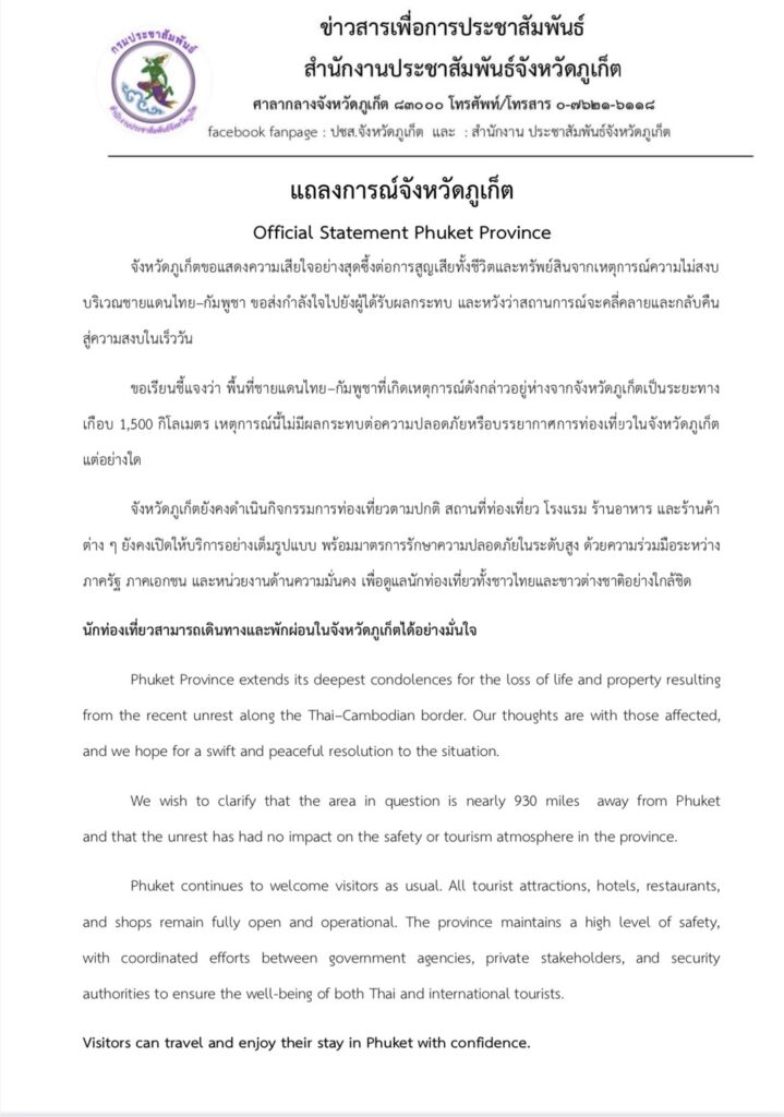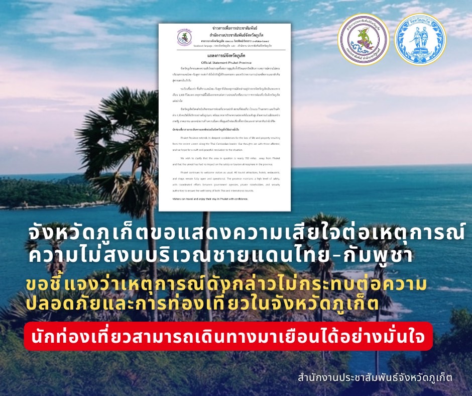 ขอเรียนชี้แจงว่า พื้นที่ชายแดนไทย–กัมพูชาที่เกิดเหตุการณ์ดังกล่าวอยู่ห่างจากจังหวัดภูเก็ตเป็นระยะทางเกือบ 1,500 กิโลเมตร เหตุการณ์นี้ไม่มีผลกระทบต่อความปลอดภัยหรือบรรยากาศการท่องเที่ยวในจังหวัดภูเก็ตแต่อย่างใด
