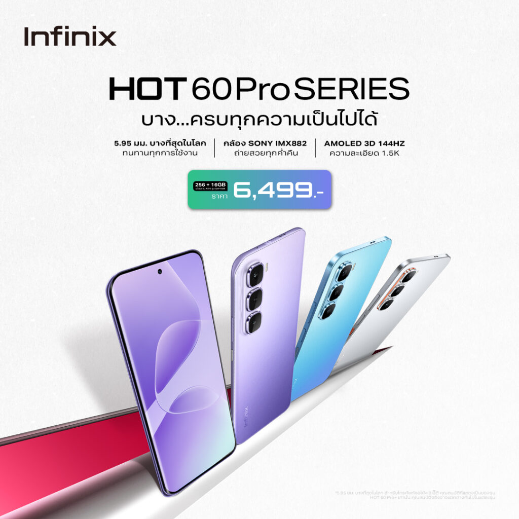 สำหรับ Infinix HOT 60 Series รุ่นใหม่ล่าสุดวางจำหน่ายอย่างเป็นทางการแล้วพร้อมกันทั่วประเทศ ในราคาสุดคุ้ม ดังนี้ รุ่นตัวท็อป HOT 60 Pro+ ความจุ 256 GB +16GB ราคา 6,499 บาท มีให้เลือกทั้งหมด 5 สี ได้แก่ Titanium Silver (เงิน), Sleek Black(ดำ), Misty Violet(ม่วง), Sonic Yellow(เหลือง) และ Coral Tides(ชมพู) รุ่น HOT 60 Pro มีให้เลือกสองขนาดได้แก่ ความจุ 256 GB +16GB ราคา 5,499 บาท ความจุ 128+16GB ราคา 4,999 บาท ใน 4 สี ได้แก่ Titanium Silver(เงิน), Sleek Black(ดำ), Sapphire Blue(ฟ้า) และ Coral Tides (ชมพู) โดยทั้งสองรุ่นสามารถสั่งซื้อได้ทางร้านค้าชั้นนำ หรือทางออนไลน์ที่ Shopee Mall: https://cutt.ly/jrA4LUyO LazMall: https://s.lazada.co.th/a.1MV3I TikTok Shop: https://cutt.ly/XrA4LeH5