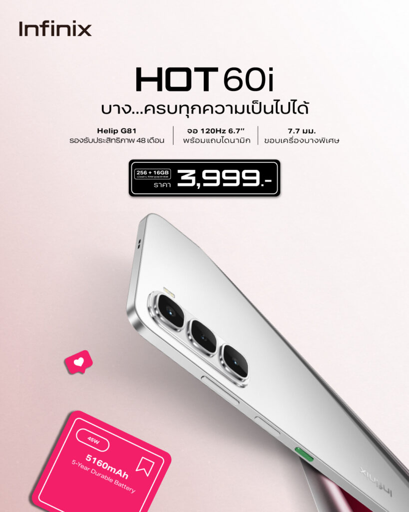 และรุ่นน้องเล็ก HOT 60i ความจุ 256 GB +16GB ราคา 3,999 บาท มีให้เลือก 3 สี ได้แก่ Titanium Silver(เงิน), Sleek Black(ดำ) และ Shadow Blue (ฟ้า) สามารถสั่งซื้อได้ผ่านร้านค้าชั้นนำทั่วประเทศที่ร่วมรายการ อาทิ BaNANA, Jaymart, IT City และ TG FONE สาขาที่ร่วมรายการ พร้อมกันนี้สามารถติดตามรายละเอียดกิจกรรม ข่าวสาร จากอินฟินิกซ์ได้ที่ https://www.facebook.com/InfinixMobileThailand/