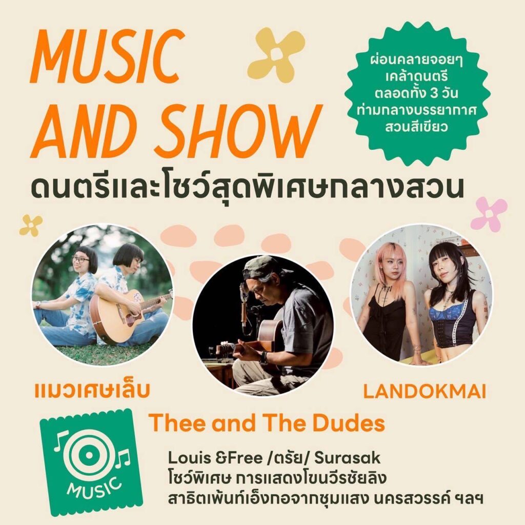 MUSIC & Show ผ่อนคลายกับเสียงดนตรีในมินิคอนเสิร์ตช่วงเย็น โดยวันที่ 15 สิงหาคม พบกับศิลปิน แมวเศษเล็บ The Voice วันที่ 16 สิงหาคม ฟังเพลง chill chill กับศิลปิน Thee and The Dudes และวันที่ 17 สิงหาคม พบกับศิลปิน LANDOKMAI นอกจากนั้นยังมีโชว์พิเศษ เช่น การแสดงโขนเด็ก “ระบำวีรชัยลิง” และสาธิตการเพ้นท์หน้าศิลปะ “เอ็งกอ” กิจกรรม Painting Thailand (วาดเมืองไทย) ปูเสื่อนั่งวาดภาพสถานที่ท่องเที่ยวเมืองไทยกลางสวน ลุ้น 50 ภาพโดนใจ รับของรางวัลพิเศษจาก อ.ส.ท.