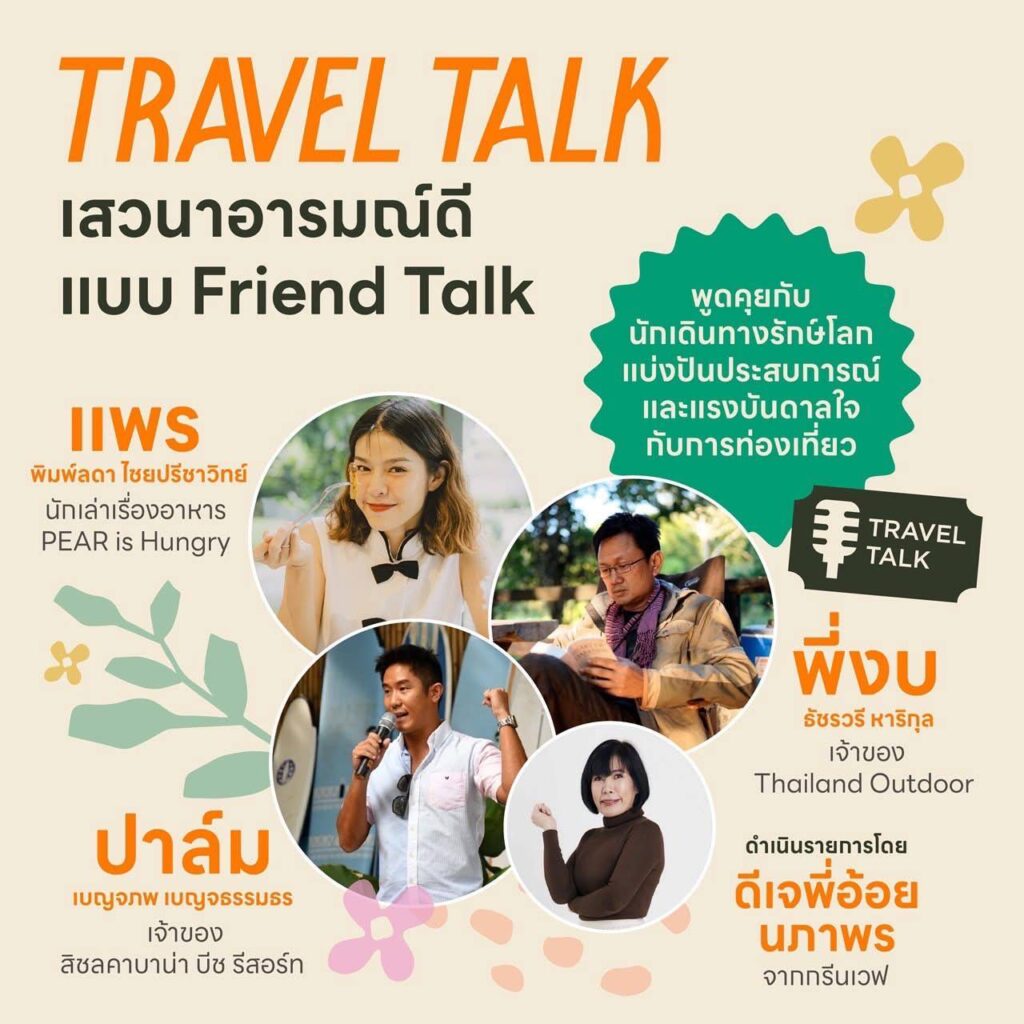TRAVEL TALK เสวนาอารมณ์ดี แบบ Friend Talk พูดคุยกับเหล่านักเดินทางรักษ์โลก พบกับ แพร พิมพ์ลดา ไชยปรีชาวิทย์ นักเล่าเรื่องอาหาร PEAR is Hungry เจ้าของแคมเปญ “กินหมดจาน”, คุณงบ ธัชรวรี หาริกุล เจ้าของ Thailand Outdoor และ คุณปาล์ม เบญจภพ เบญจธรรมธร เจ้าของสิชลคาบาน่า บีช รีสอร์ท ดำเนินรายการโดย ดีเจ.พี่อ้อย นภาพร จากกรีนเวฟ