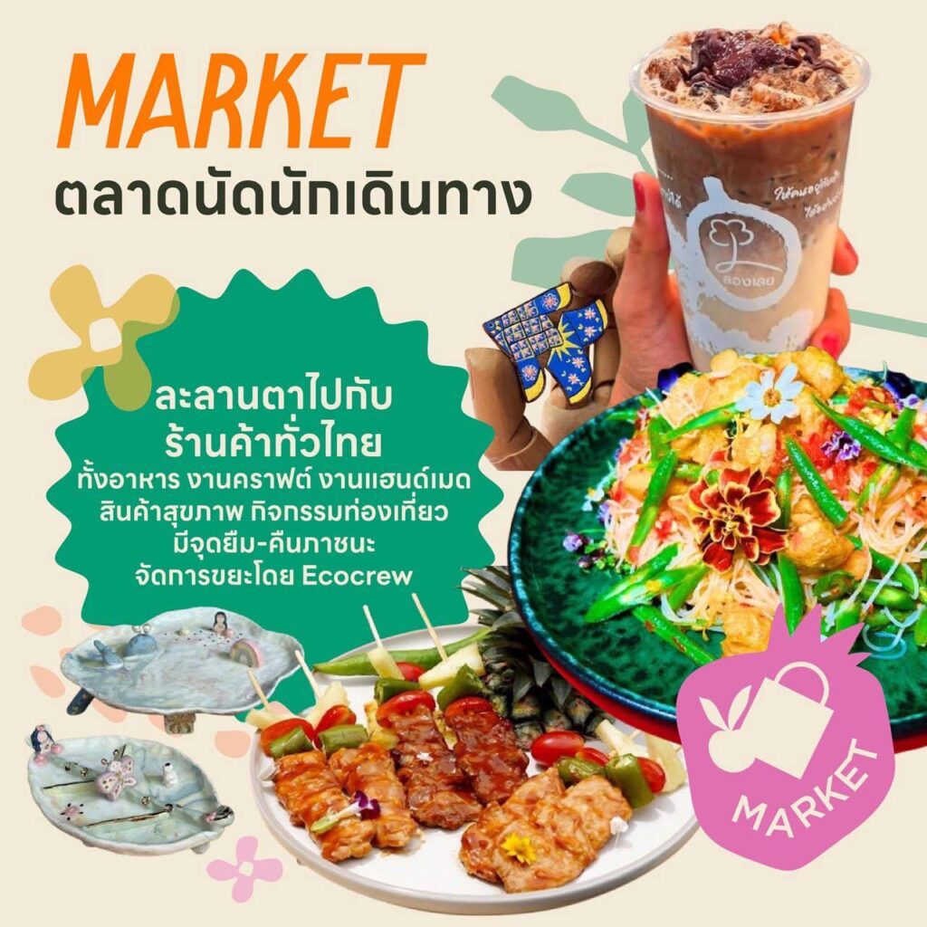 MARKET ตลาดนัดนักเดินทาง รวมร้านค้าคัดสรรที่สะท้อนวิถีชีวิตอย่างมีสไตล์ ทั้งของกิน งานคราฟต์ ของแต่งบ้านแนวรักษ์โลก และสินค้าจากชุมชนทั่วไทย อาทิ กลิ่นสีและกาวแป้ง แบรนด์ของมือสองที่นำผ้าเช็ดหน้ามา Upcycling ให้เป็นกระเป๋าสุดเก๋, Same.Thang กระเป๋าอัพไซเคิลจากซองกาแฟ, NOK Phanit+Granit in the House คราฟต์เซรามิกและหินจากชลบุรี รวมถึงโซน Food Market จากร้านดังทั่วไทย เช่น Goodjee by สามชัยกรุ๊ป อุบลราชธานี, ร้านลองเลย จ.เลย และอีกมากมาย