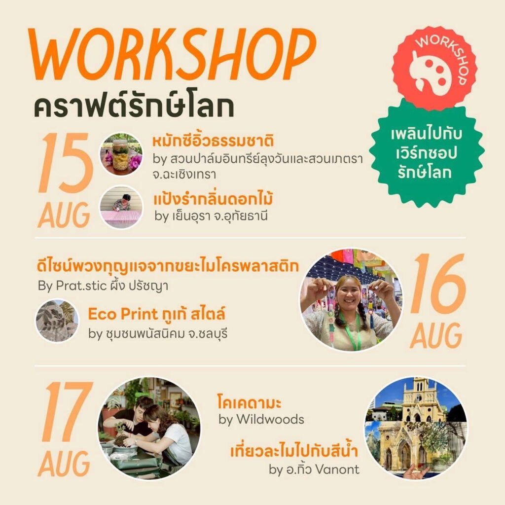 WORKSHOP คราฟต์รักษ์โลก เรียนรู้ศิลปะ โคเคดามะ ศิลปะแห่งการปั้นลูกบอลมอส ไม้ประดับสไตล์ญี่ปุ่นโบราณ, เที่ยวละไมไปกับสีน้ำ by อ.กิ้ว Vanont วาดภาพระบายสีน้ำผ่านภาพถ่ายเมืองไทยจากเล่มนิตยสาร อ.ส.ท., เรียนรู้การหมักซีอิ้วธรรมชาติ, การทำแป้งร่ำดอกไม้สด, Workshop ผ้าเช็ดหน้า Eco Print และดีไซน์พวงกุญแจจากเศษขยะไมโครพลาสติก