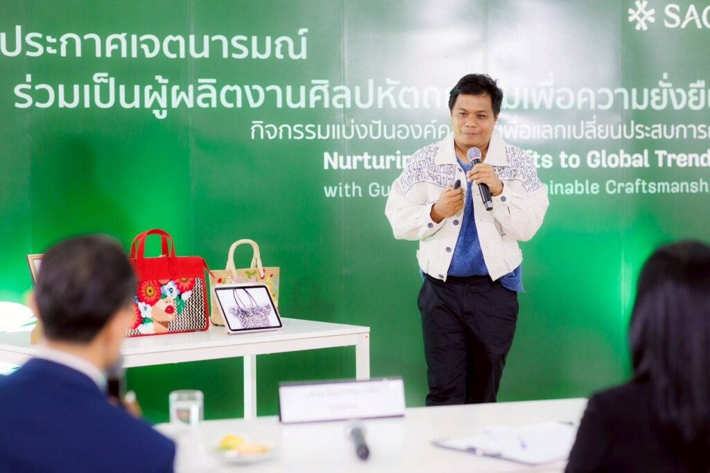 ผศ.ดร.อนุชา ทีรคานนท์ ผู้อำนวยการสถาบันส่งเสริมศิลปหัตถกรรมไทย (องค์การมหาชน) หรือ SACIT เป็นประธานมอบ “ใบประกาศเจตนารมณ์การร่วมเป็นผู้ผลิตงานศิลปหัตถกรรมอย่างยั่งยืน” แก่ผู้ผลิตงานศิลปหัตถกรรมที่ได้รับการคัดเลือกจำนวน 20 ราย เข้าร่วมกิจกรรมแบ่งปันองค์ความรู้การนำแนวคิด ESG มาใช้ในการผลิตผลงานศิลปหัตถกรรม “การพัฒนาอย่างยั่งยืนตามแนวคิด ESG” ณ ห้องสมุดบรรณศิลปาคาร ชั้น 1 อาคารพระมิ่งมงคล โดยผู้ผ่านการคัดเลือกทั้ง 20 ราย ได้นำเสนอแนวทางการปรับใช้ ESG Business Canvas ในกระบวนการผลิตผลงานศิลปหัตถกรรมของตนต่อคณะกรรมการ โดยการคัดเลือกได้รับเกียรติจากคณะกรรมการผู้ทรงคุณวุฒิซึ่งมีความเชี่ยวชาญในด้านศิลปหัตถกรรม เศรษฐกิจสร้างสรรค์ และการพัฒนาอย่างยั่งยืน ได้แก่