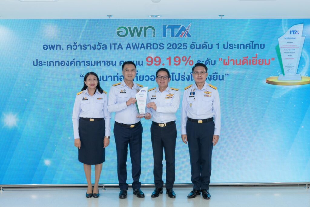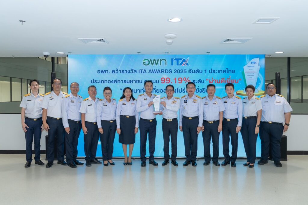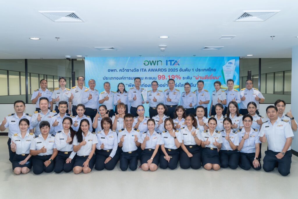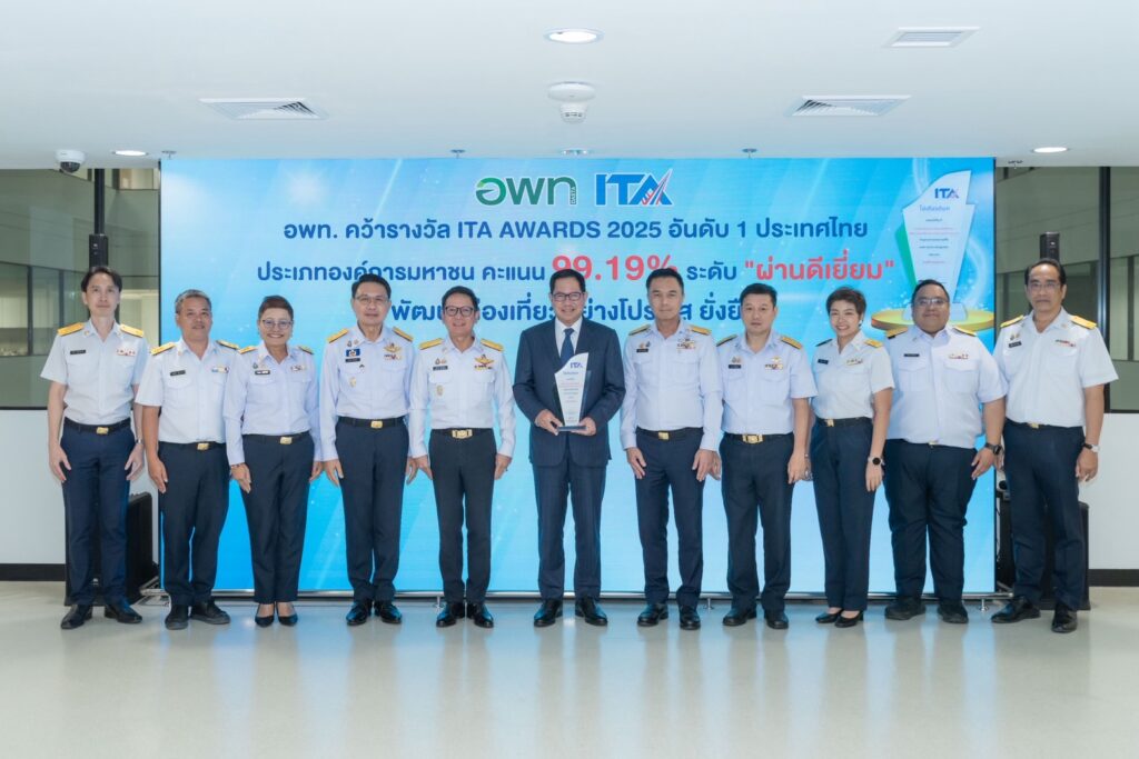 นายฐิติพงศ์ เขียวไพศาล ประธานกรรมการ พพท. พร้อมด้วย นายศิริปกรณ์ เชี่ยวสมุทร ผู้อำนวยการ อพท. ดร.ชูวิทย์ มิตรชอบ รองผู้อํานวยการ อพท.(1) ดร.ชุมพล มุสิกานนท์ รองผู้อํานวยการ อพท.(2) และ นางสาววัชรี ชูรักษา ผู้ช่วยผู้อํานวยการ อพท. รวมถึงคณะผู้บริหารและเจ้าหน้าที่ อพท. ร่วมบันทึกภาพแสดงพลังในโอกาสที่ อพท. ได้รับรางวัล ITA Awards 2025 ณ โถงด้านหน้า อพท. ชั้น 4 ศูนย์ราชการเฉลิมพระเกียรติฯ อาคาร C