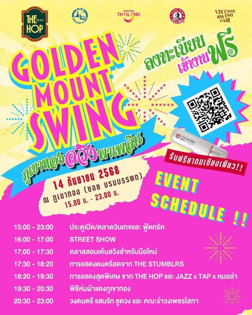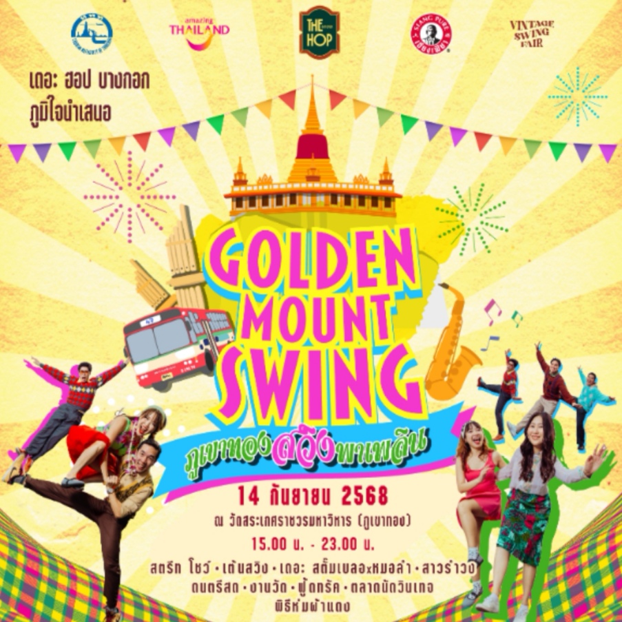 กรุงเทพ – 3 กันยายน 2568 ปรากฎการณ์ครั้งใหม่ในไทยสุดสร้างสรรค์จาก The Hop Bangkok เมื่อการเต้นสวิงและจังหวะแจ๊สผสานดนตรีหมอลำ กับบรรยากาศงานวัดวินเทจ ในงาน “ภูเขาทอง สวิงพาเพลิน: Golden Mount Swing 2025” ในวันอาทิตย์ที่ 14 กันยายน 2567 เวลา 15.00- 23.00 น. งานนี้ได้รับการสนับสนุนจากการท่องเที่ยวแห่งประเทศไทย (ททท.) รวมถึงภาครัฐและเอกชน โดยแนวคิดหลักของงานคือ การผสมผสานวัฒนธรรมไทยและตะวันตกอย่างลงตัว ผ่านดนตรี การเต้นรำ และ วิถีชีวิตของชุมชนในรูปแบบตลาดวินเทจ