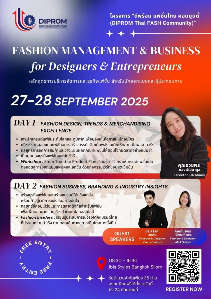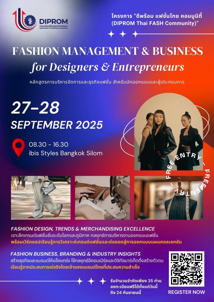 ชวนสายแฟฯ อัปเกรดสกิลธุรกิจ เสริมพลังนักออกแบบและผู้ประกอบการแฟชั่นด้วยหลักสูตร “Fashion Management & Business for Designers & Entrepreneurs” ภายใต้โครงการ “ดีพร้อม แฟชั่นไทย คอมมูนิตี้ (DIPROM Thai FASH Community)”