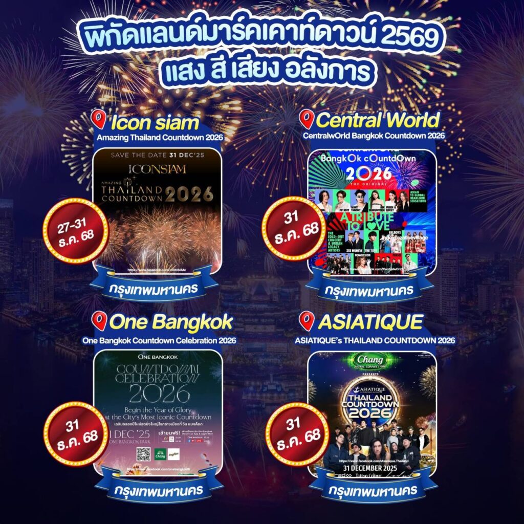 กรุงเทพมหานคร : แสง สี เสียง อลังการ ✨ ICONSIAM: Amazing Thailand Countdown 2026 ริมแม่น้ำเจ้าพระยา (27-31 ธ.ค. 68) ✨ centralwOrld: Times Square of Asia สุดมันส์ใจกลางเมือง (31 ธ.ค. 68) ✨ One Bangkok: แลนด์มาร์คใหม่กับ One Bangkok Countdown Celebration 2026 (31 ธ.ค. 68) ✨ Asiatique The Riverfront: บรรยากาศริมน้ำสุดชิลล์ (31 ธ.ค. 68)