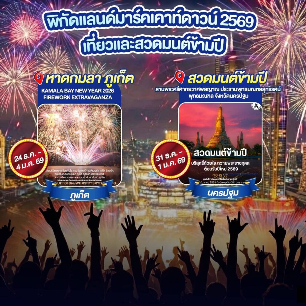 เที่ยวและสวดมนต์ข้ามปี : สิริมงคลรับปีใหม่ นครปฐม: สวดมนต์ข้ามปี “สวดมนต์และปฏิบัติธรรมข้ามปี บริสุทธิ์ด้วยใจ ถวายพระราชกุศล” ณ ลานพระศรีศากยะทศพลญาณ ประธานพุทธมณฑลสุทรรศน์ พุทธมณฑล จังหวัดนครปฐม (31 ธ.ค. 68 – 1 ม.ค. 69) ️ ภูเก็ต: หาดกมลา Firework Extravaganza (24 ธ.ค. 68 – 4 ม.ค. 69)