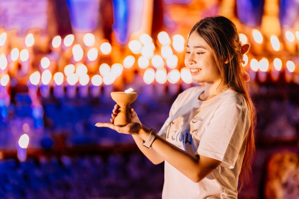 ภายในงาน นอกจากจะได้สำรวมจิตใจตั้งจิตภาวนาเวียนเทียนตะคันและอธิษฐานขอพรอันเป็นมงคลแล้ว ยังได้สัมผัสบรรยากาศที่เปี่ยมด้วยมนต์ขลัง จากแสงไฟของตะคัน สะท้อนผิวน้ำของโบราณสถานวัดตระพังทองที่งดงามราวภาพฝัน และยังได้ร่วมอุดหนุนชุมชน ชม ชิม ช้อป แชร์ กับตลาดรถไส ที่มีทั้งของกินท้องถิ่น ของใช้ของฝากของที่ระลึกที่หลากหลาย