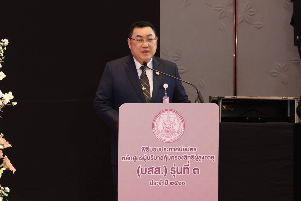 นายอัครา กล่าวต่อไปว่า สำหรับโครงการบริบาลและคุ้มครองสิทธิผู้สูงอายุในชุมชน ถือเป็นการเตรียมความพร้อมรองรับสังคมสูงอายุ โดยกรมกิจการผู้สูงอายุ (ผส.) กระทรวง พม. มุ่งสร้าง ผู้บริบาลคุ้มครองสิทธิผู้สูงอายุ อันเป็นกลไกสำคัญในการดูแลผู้สูงอายุในชุมชนท้องถิ่น ทั้งในด้านการช่วยเหลือ ดูแล คุ้มครองสิทธิ และพัฒนาคุณภาพชีวิตผู้สูงอายุอย่างครอบคลุม 5 มิติ ได้แก่ สังคม สุขภาพ เศรษฐกิจ สภาพแวดล้อม และเทคโนโลยี เพื่อให้ผู้สูงอายุมีคุณภาพชีวิตที่ดีและดำรงชีวิตอย่างมีศักดิ์ศรี ทั้งนี้ ขอแสดงความยินดีกับผู้บริบาลคุ้มครองสิทธิผู้สูงอายุ (รายใหม่) ทุกคน และขอให้ปฏิบัติหน้าที่ด้วยความเสียสละ ยึดมั่นในจริยธรรมวิชาชีพ และคำนึงถึงประโยชน์สูงสุดของผู้สูงอายุ เพื่อร่วมกันเสริมสร้างครอบครัวเข้มแข็งและชุมชนที่อบอุ่นต่อไป
